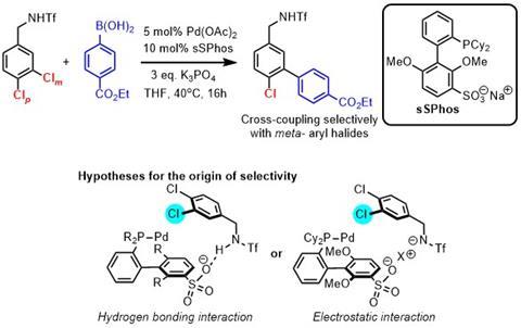 The Phipps group has also developed a catalyst-driven approach to controlling site-selectivity in Suzuki couplings. These cross-coupling reactions are one of the most widely used reactions by medicinal chemists. The reaction (shown left) uses electrostatic interactions between the ligand and substrate to direct site-selective oxidative addition. The students involved in the work with Phipps – William Golding and Robert Pearce-Higgins – were both part of the AZ-Cambridge PhD program.