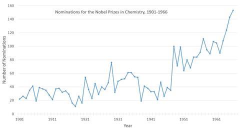 A graph showing the increasing number of Nobel Prize nominees for 1901-1966
